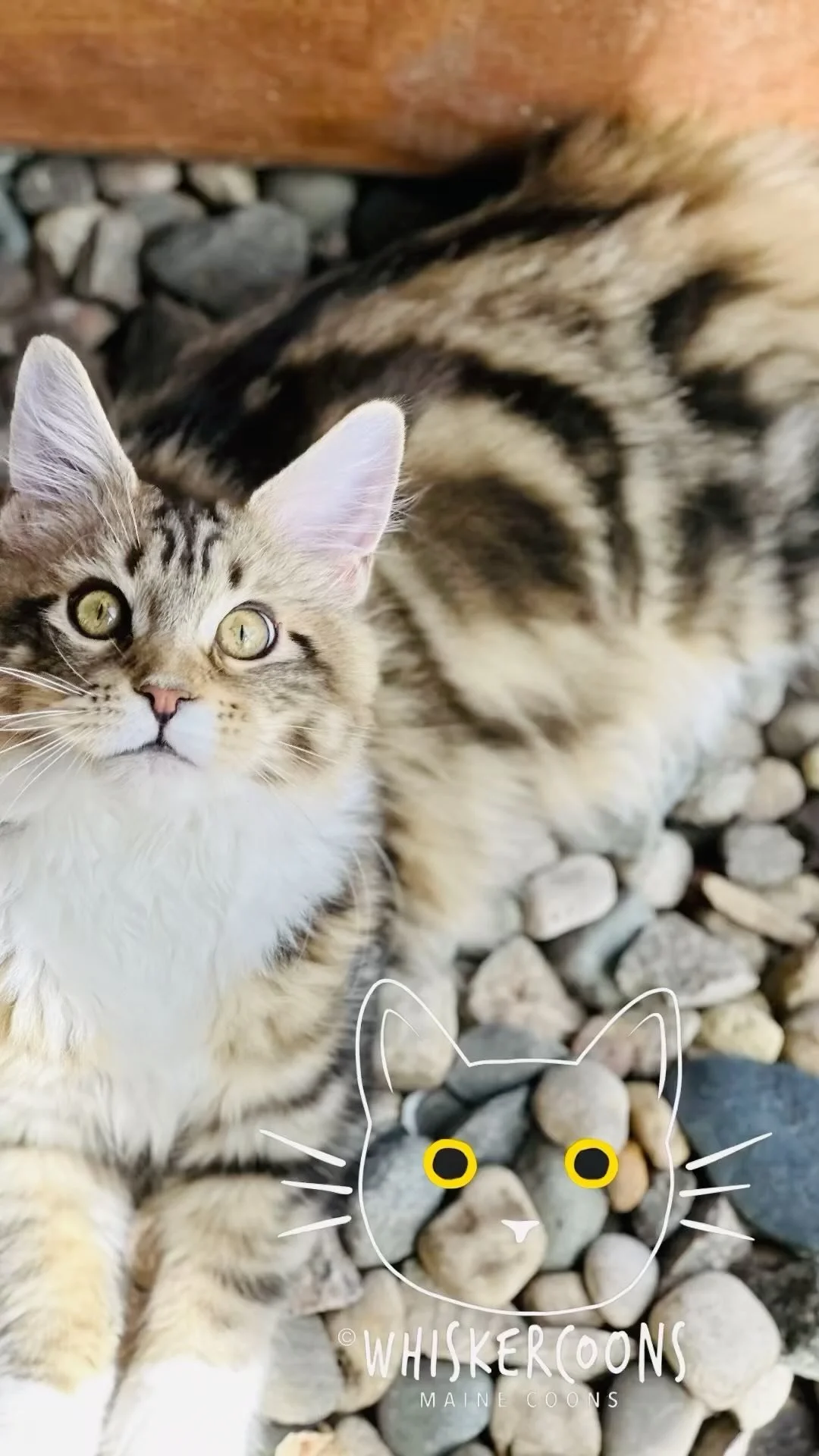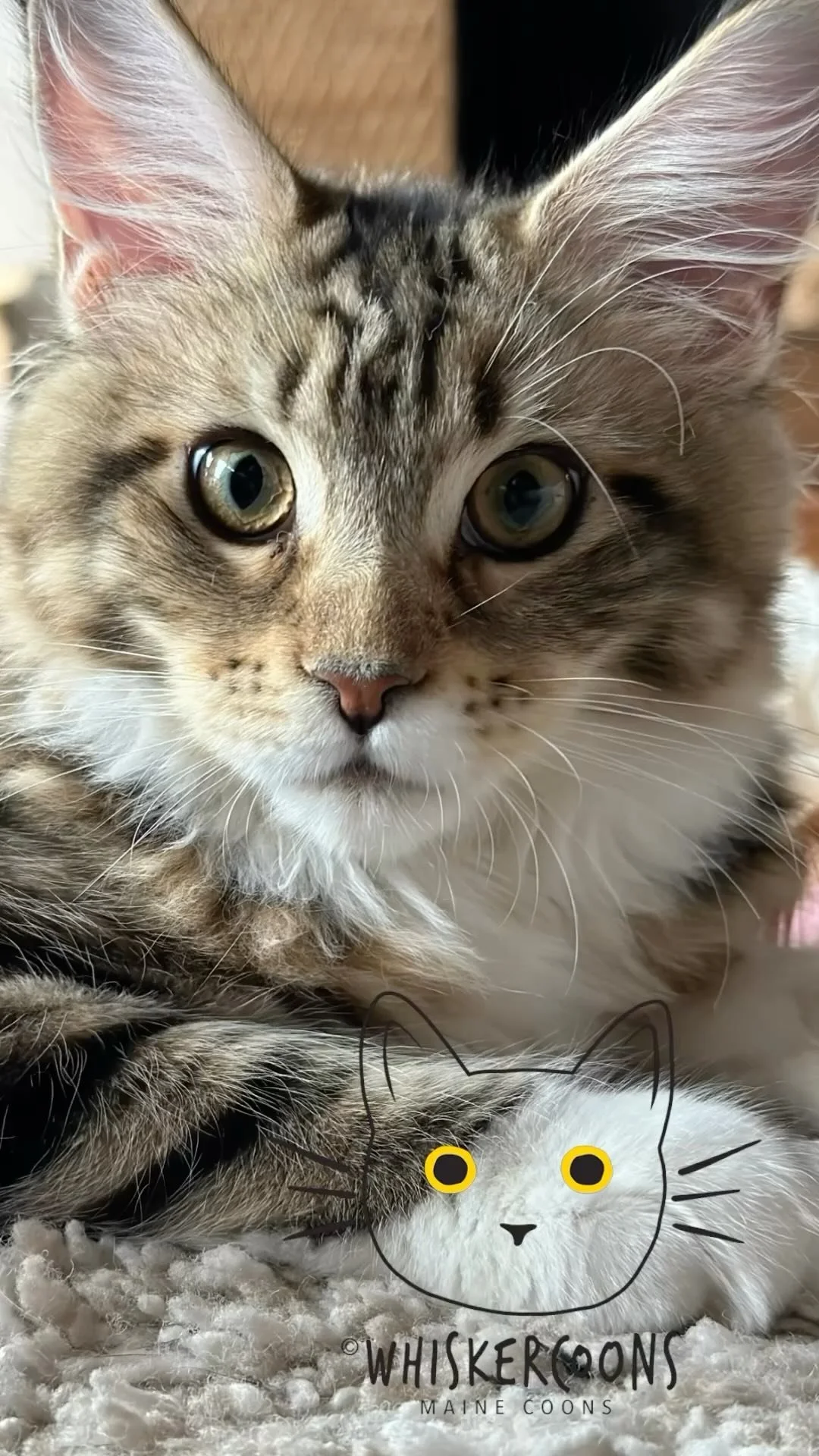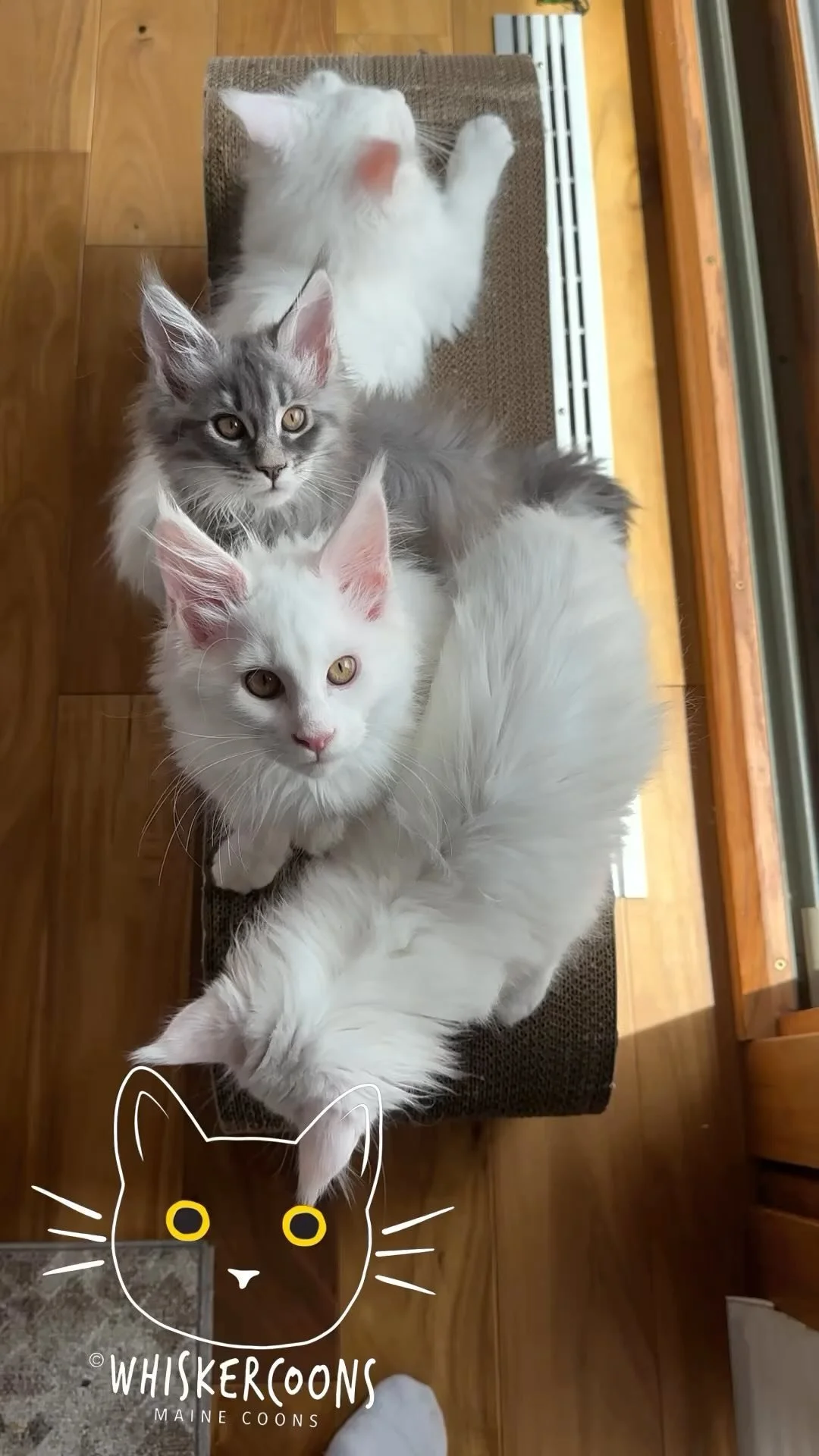 A captivating white female Maine Coon with a silky snow-like coat and majestic tufted features. Her golden yellow eyes sparkle with curiosity, reflecting a playful soul that turns ordinary moments into delightful adventures. Ella's impressive agility, showcased in acrobatic leaps and movements, adds to her charm.